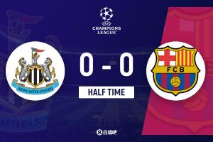 上半场伤停补时1分钟,半场结束,巴萨暂0-0纽卡。