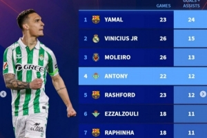 体育资讯3月12日讯 德转盘点了本赛季西甲边锋位置球员在联赛中参与进球榜,其中亚马尔居首,具体榜单如下(进球+助攻):