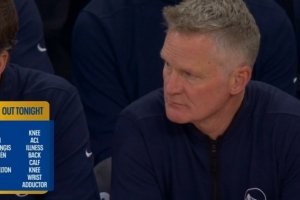 比赛中,转播方晒出了勇士的伤病名单,以下球员今天都不能出战: